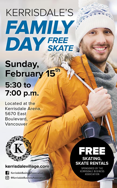 Sunday, December 14 from 5:30 – 7 pm – free skate and skate rentals at the Kerrisdale Arena